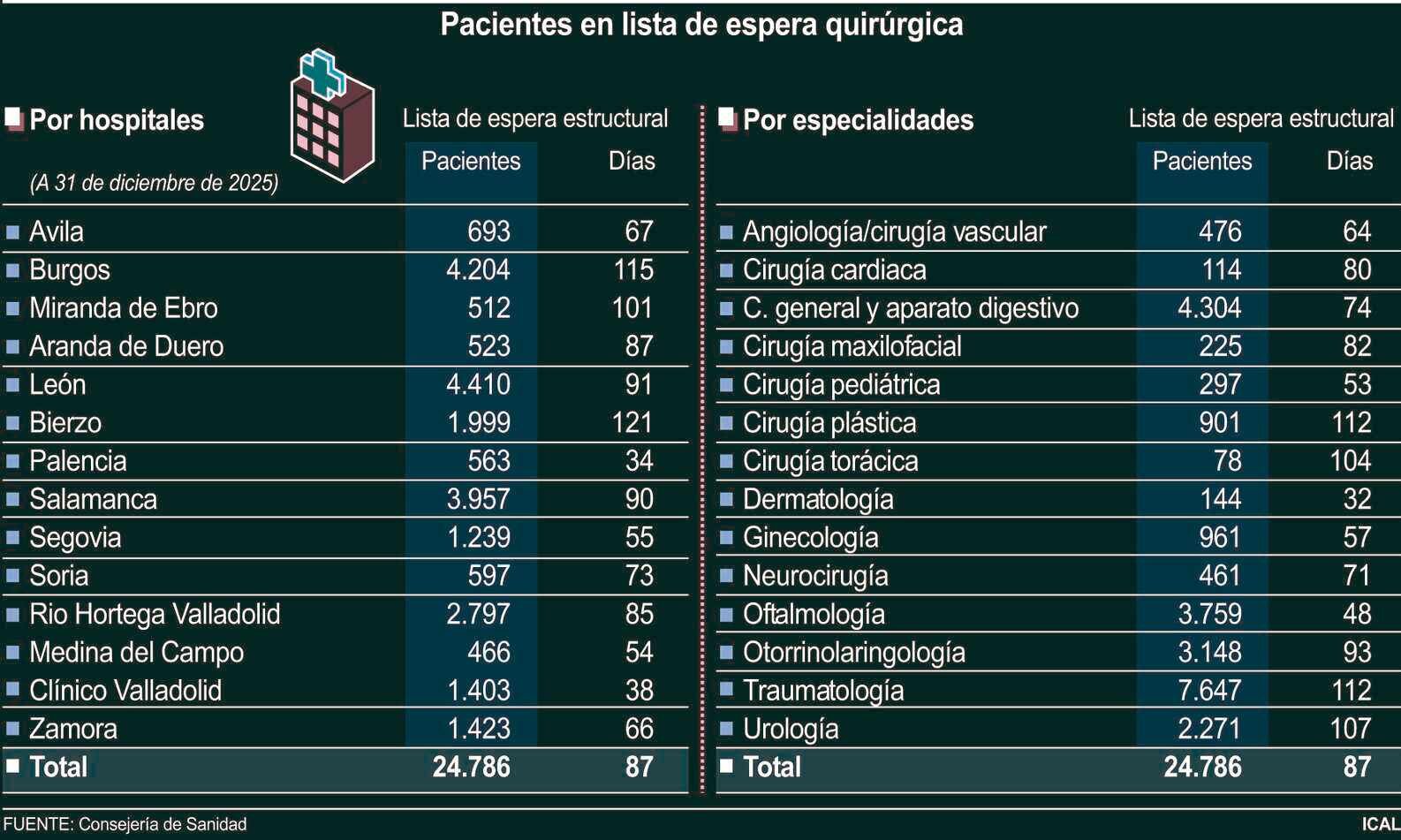 A nivel autonómico, los pacientes de Castilla y León esperaron una media de 87 días para ser intervenidos quirúrgicamente en los hospitales públicos al cierre de 2025. Esta cifra supone una reducción de ocho días respecto al mismo periodo de 2024, cuando la demora media alcanzaba los 95 días.