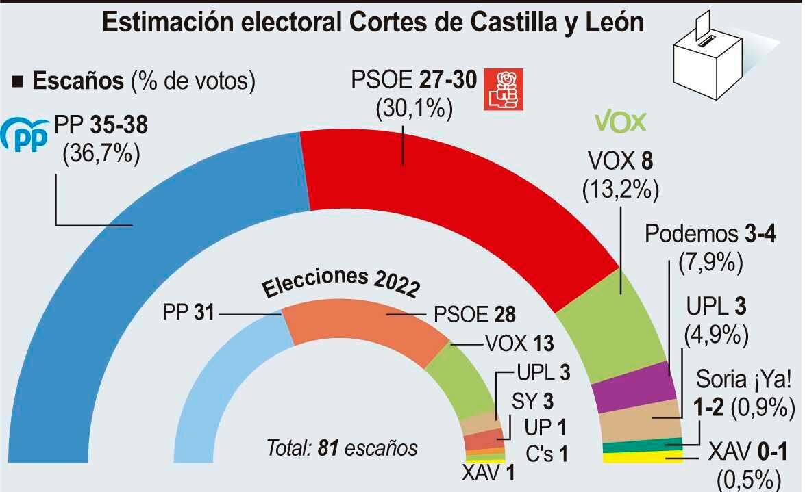 El Partido Popular volvería a ganar las elecciones autonómicas de Castilla y León si se celebraran en este momento al conseguir el 36,7 por ciento de los votos y entre 35 y 38 procuradores, lo que le permitiría gobernar la Junta en solitario, pero con pactos puntuales, o reeditar una coalición. Los socialistas serían la segunda fuerza, con el 30,1 por ciento de los votos y entre 27 y 30 parlamentarios, mientras Vox se quedaría con ocho y como tercer partido de las Cortes.