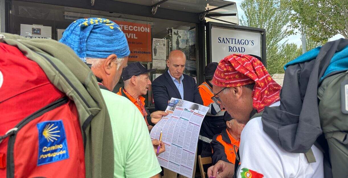 El alcalde de León, José Antonio Diez, visitó este miércoles el punto informativo acompañado por el concejal de Protección Civil, Álvaro Pola, donde resaltó el “trabajo altruista que desempeñan los voluntarios que prestan un servicio tan importante y demandado por los peregrinos que hacen el Camino de Santiago y recalan en la ciudad de León”.