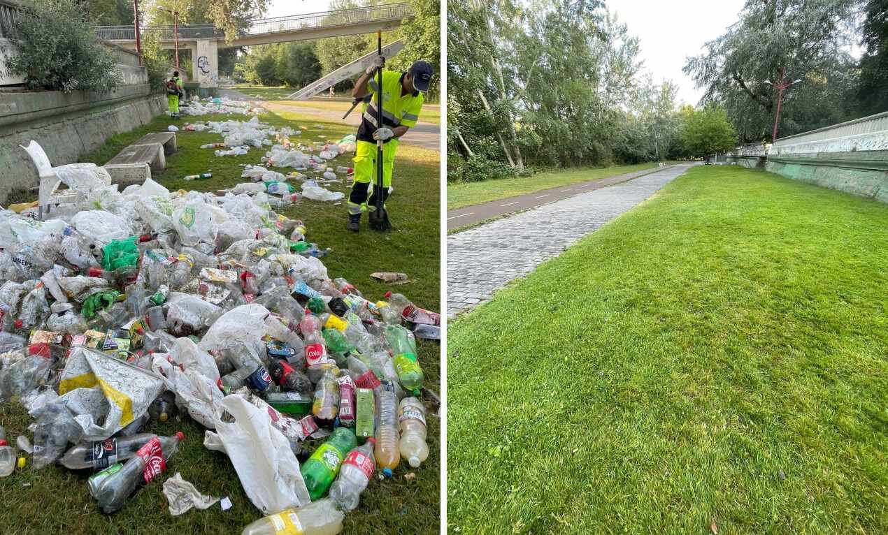 Botellones, vasos, botellas y bolsas se acumulaban desde primeras horas del sábado en los espacios naturales más concurridos, especialmente junto al río. Lo que para muchos fue una noche de diversión, para los equipos de limpieza supuso un reto de grandes dimensiones. En este contexto, el trabajo de la UTE ‘León verde y azul’ resultó crucial.