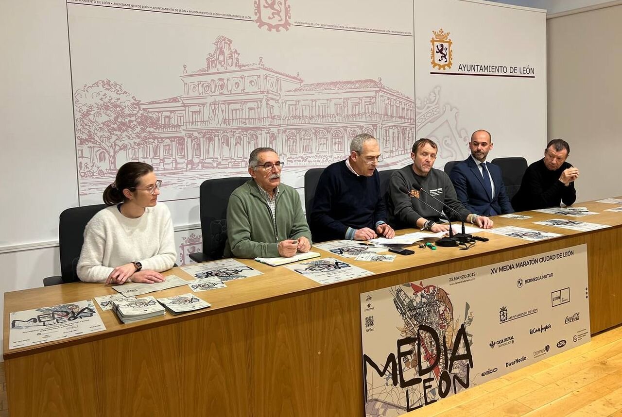 El concejal de Deportes, Vicente Canuria, ha presentado el evento acompañado de José Enrique Villacorta, presidente del club Sprint Atletismo León, Estanislao Calabuig, presidente de la Asociación Española Contra el Cáncer en León, Francisco Jorquera, responsable del servicio de Digestivo del Hospital Universitario de León, Francisco González, responsable de empresas de Caja Rural y María Perrino, directora de deportes de la Universidad de León.
