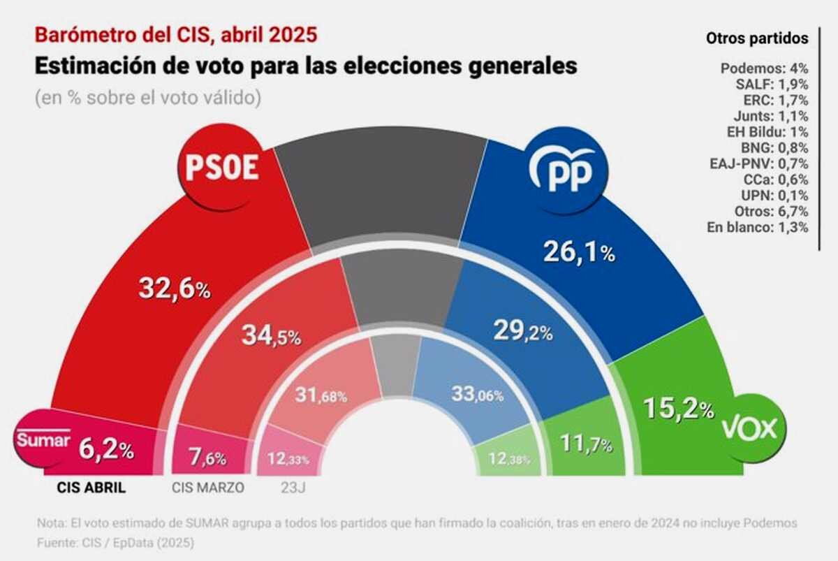 En el espectro de la izquierda alternativa, Sumar continúa su tendencia descendente y cae al 6,2%, su cifra más baja desde las elecciones generales de 2023. Podemos, por su parte, recupera algo de terreno y se sitúa en el 4%, acercándose peligrosamente al proyecto que lidera Yolanda Díaz.