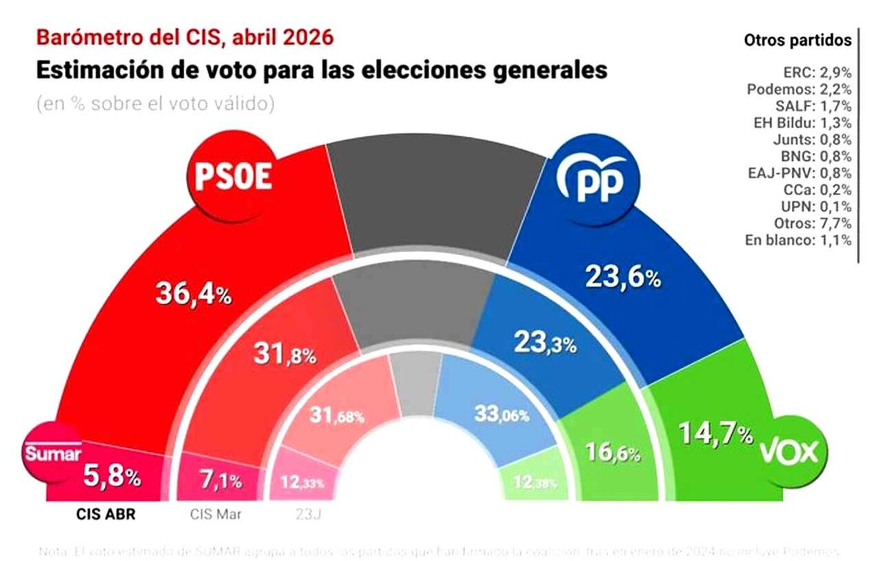 El último barómetro del Centro de Investigaciones Sociológicas correspondiente a abril de 2026 otorga una posición claramente dominante al PSOE. La formación liderada por Pedro Sánchez alcanza el 36,4% de estimación de voto, mejorando sus datos del mes anterior y ampliando su ventaja frente a sus principales competidores.