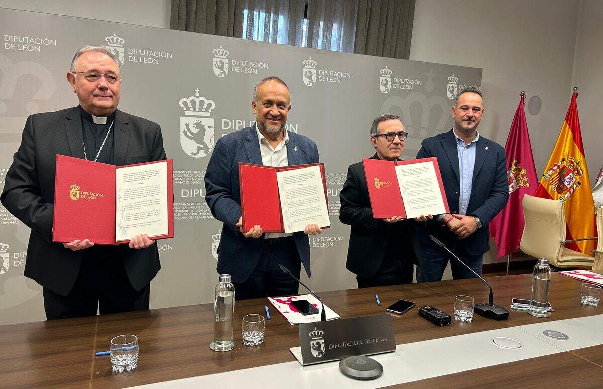 El presidente de la Diputación de León, Gerardo Álvarez Courel, el obispo de León, Luis Ángel de las Heras, y el administrador de la Diócesis de Astorga, Francisco Javier Gay, suscribieron este miércoles el acuerdo de colaboración que permitirá la realización de obras de reparación necesarias para la conservación de iglesias y ermitas de titularidad eclesiástica situadas en entidades locales de la provincia con población inferior a 20.000 habitantes.