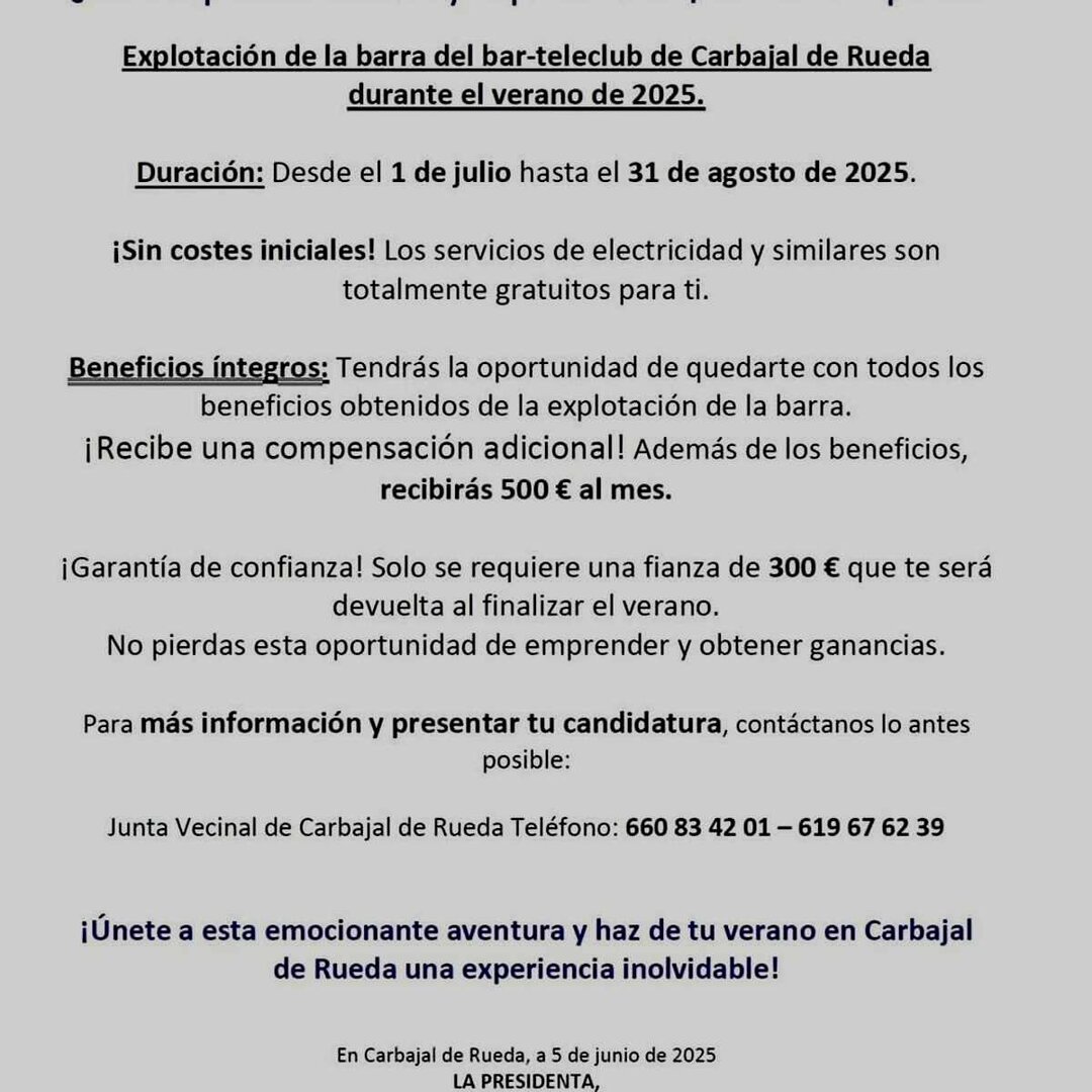 La Junta Vecinal de Carbajal de Rueda mantiene abierto el plazo desde el pasado día 5 para la presentación de ofertas para la explotación del bar-teleclub de la localidad durante el verano de 2025. Una propuesta dirigida a emprendedores o interesados en gestionar el servicio durante los meses estivales, con condiciones especialmente ventajosas.