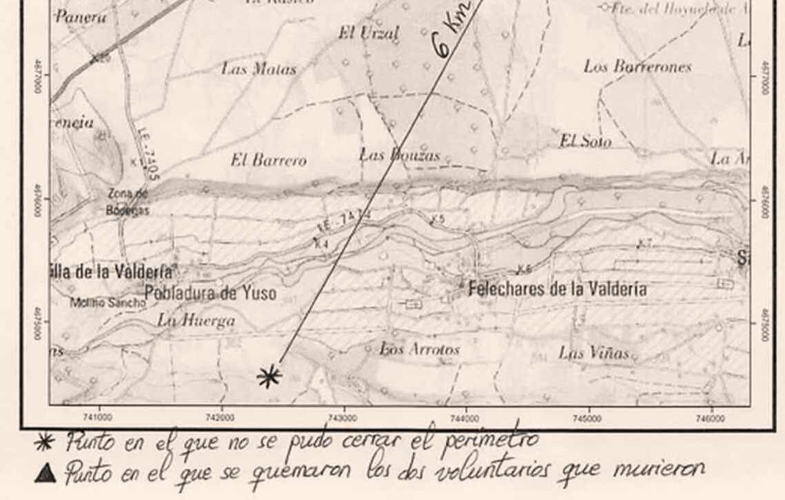El momento decisivo llegó el mediodía del 12 de agosto. Tierra y vecinos casi habían cerrado el perímetro, y un helicóptero apoyó la labor hasta verse obligado a repostar. Los agentes señalan que pidió relevo aéreo y que con “dos o tres descargas” se habría dado por liquidada la zona, pero ese refuerzo nunca llegó. La brecha, de apenas 20 metros, se reavivó con fuerza alrededor de las 13:00 horas, generando “varias reproducciones entre Felechares y Castrocalbón y al sur de Pinilla”. El informe detalla que aquella “lengua de fuego” cruzó el río Eria y, seis kilómetros más adelante, provocó la muerte de dos voluntarios.