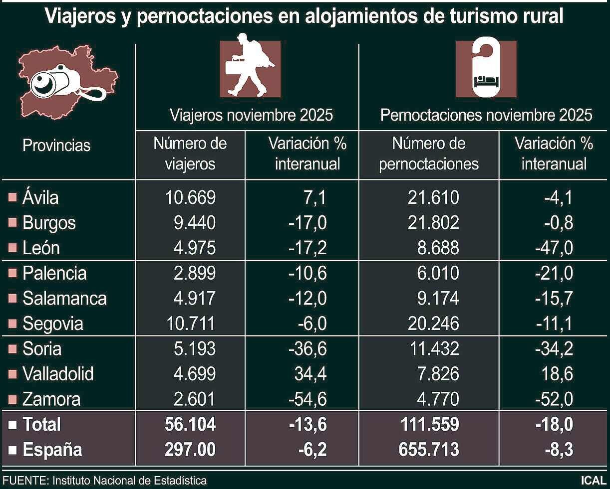 En el global autonómico, Castilla y León volvió a encabezar el ranking nacional de turismo rural con 111.559 pernoctaciones en noviembre, aunque la cifra representa una caída interanual del 18 por ciento. El número de viajeros también retrocedió, hasta los 56.104, un 13,6 por ciento menos. Aun así, la Comunidad se mantuvo muy por delante de Castilla-La Mancha (80.434 pernoctaciones), Cataluña (74.749), Andalucía (67.375) y Baleares (39.926).
