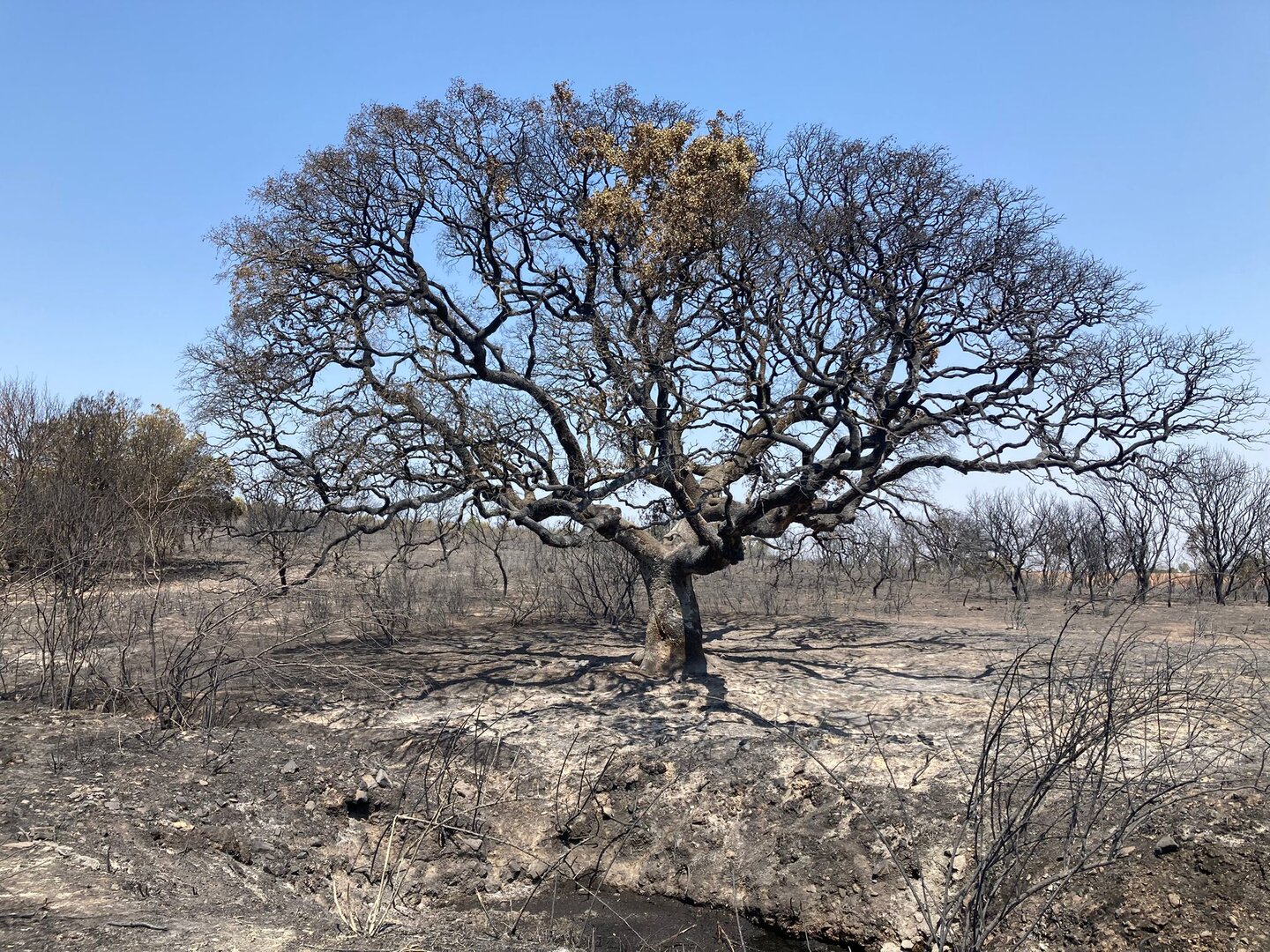 La 'Encinona', el gigante de Genestacio, cae ante el fuego pero no se rinde y podría renacer