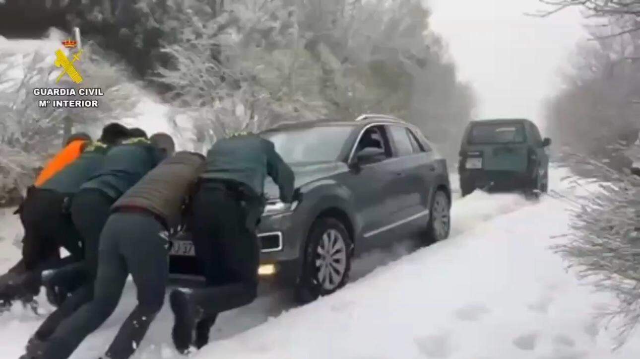 La Guardia Civil tuvo que intervenir en la mañana de este sábado, 7 de febrero, para auxiliar a seis personas que habían quedado atrapadas por la nieve en un camino rural del término municipal de Crémenes, en León.