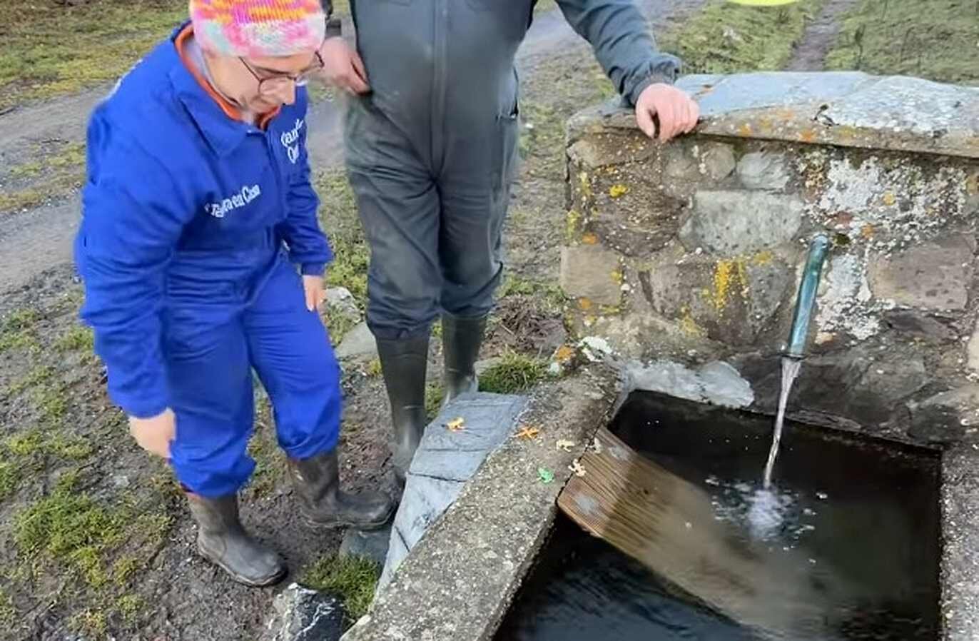 Otra ganadera, Aida Rodrigo, acompañada por un ganadero, ironiza en el Pilo de Casasola en Murias de Paredes sobre estas obras.