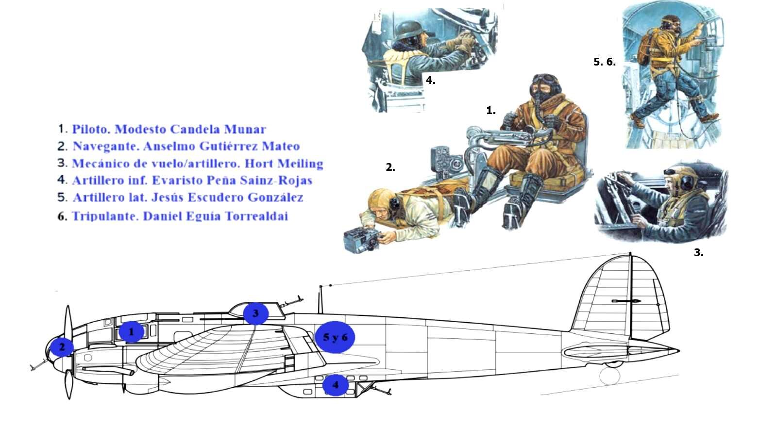 Los seis tripulantes fueron identificados como Modesto Candela Munar, Anselmo Gutiérrez Mateo, Evaristo Peña Sainz-Rojas, Jesús Escudero González, Daniel Eguía Torrealdai y el mecánico alemán Horst Meiling. Dos de ellos aparecieron calcinados en el interior del fuselaje y el resto, semienterrados por la nieve en las inmediaciones.