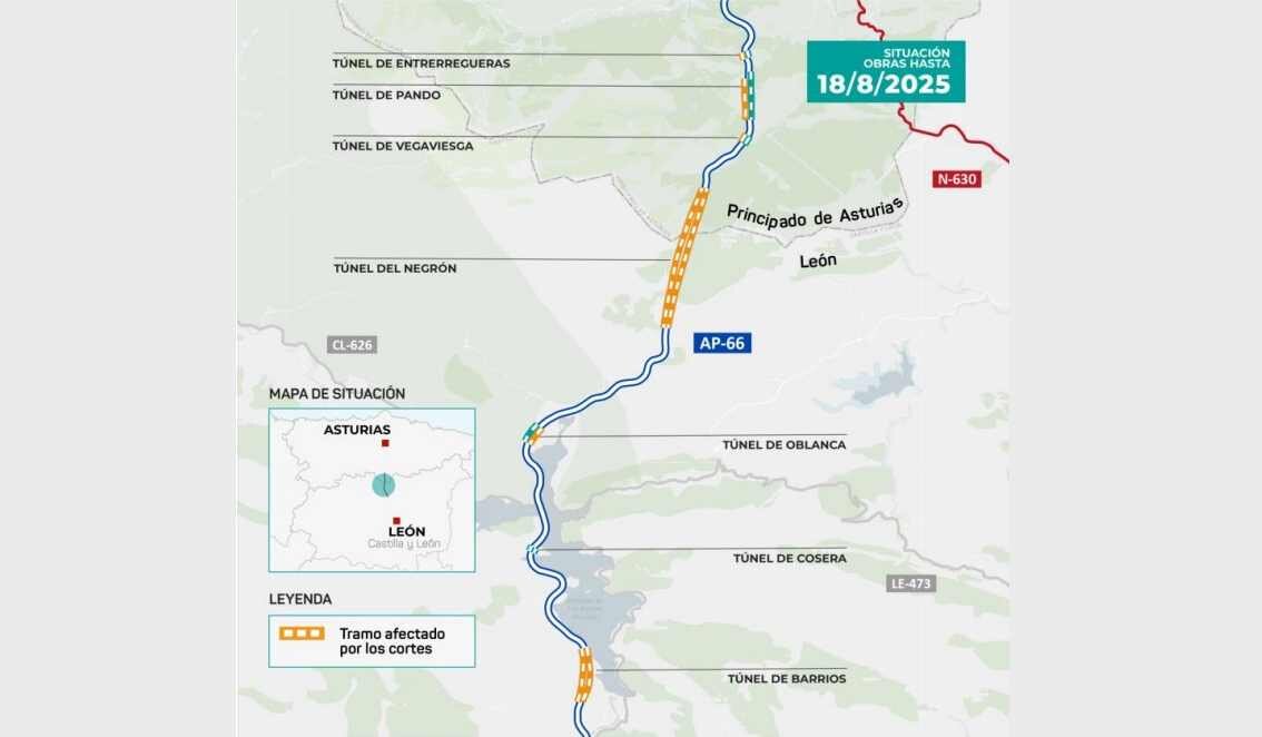 El Ministerio de Transportes y Movilidad Sostenible continúa con su plan de modernización de los túneles de la AP-66 entre León y Asturias, con una inversión total de 68,14 millones de euros. Las obras, incluidas en el Plan de Recuperación, Transformación y Resiliencia y financiadas con fondos NextGenerationEU, se centran en mejorar la seguridad y la operatividad de las infraestructuras entre los kilómetros 75,860 y 101,900.