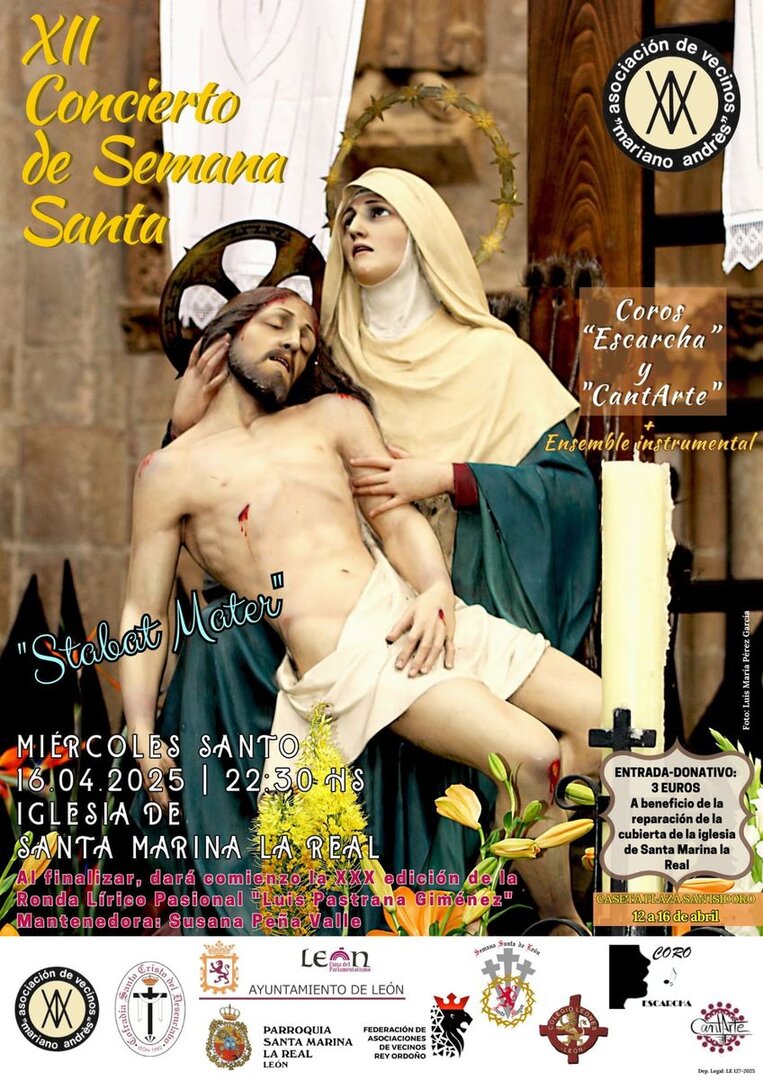 La Iglesia de Santa Marina la Real acogerá la noche del Miércoles Santo, a partir de las 22:30 horas, el concierto musical 'Stabat mater dolorosa', a cargo de los coros Escarcha y CantArte, junto con un ensemble instrumental reunido para la ocasión.