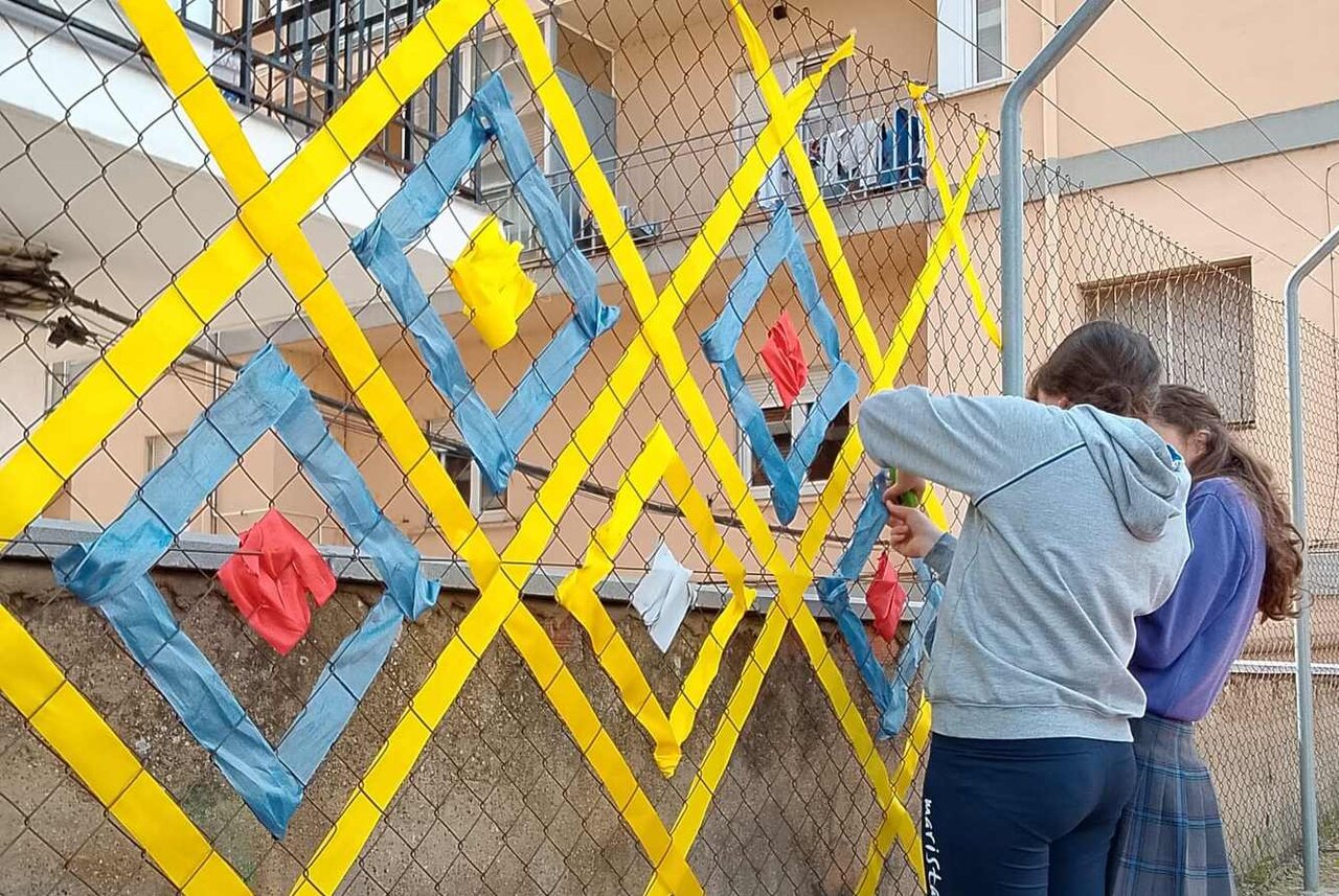 La propuesta ha consistido en la creación de una estructura visual basada en cintas de tela —algunas de ellas recicladas— y materiales plásticos de colores como amarillo, rojo, verde, azul y blanco. El resultado es una композиción “geométrica, simétrica y equilibrada”, construida mediante líneas oblicuas, paralelas y perpendiculares, además de formas cuadradas.