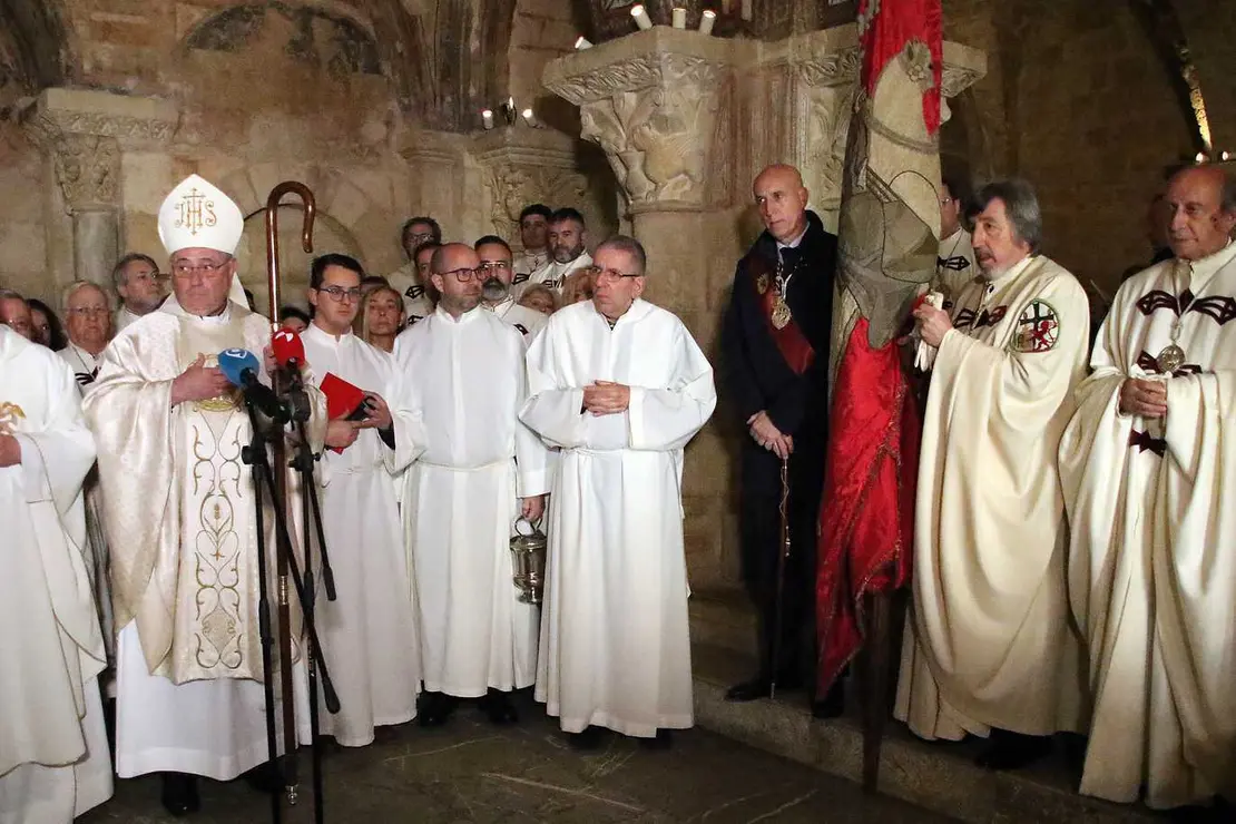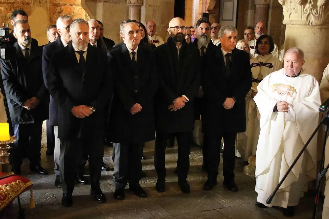 En el último turno, los miembros de la cofradía conocida como Pendón de Baeza fueron acompañados por autoridades civiles y militares leoneses, entre los que se encontraba el presidente de las Cortes de Castilla y León, Carlos Pollán, antes de iniciarse la procesión ciriada y con cruz en alto que recorre las naves del templo.