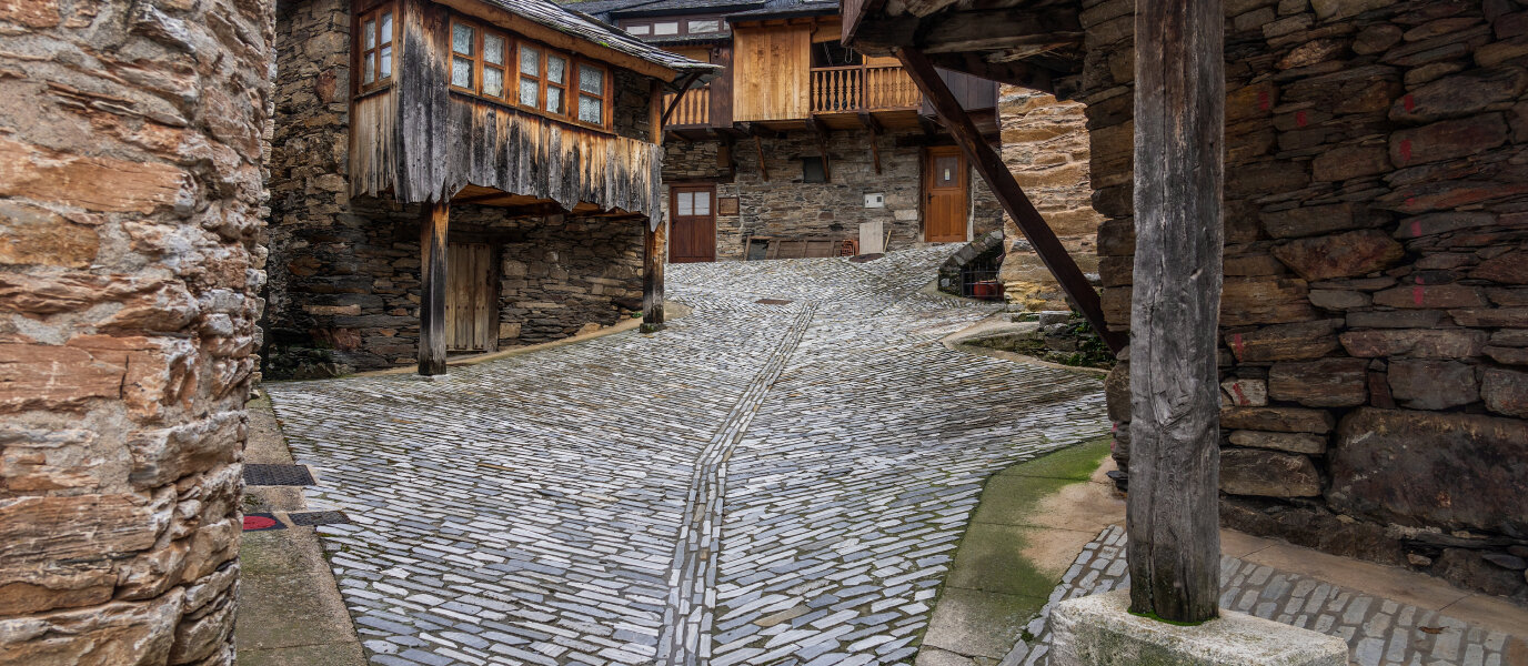 Las casas, construidas en piedra de pizarra marrón y con tejados negros, forman un conjunto compacto que gira en torno a una iglesia mozárabe del siglo X. Sus calles empedradas, los corredores de madera y el silencio que reina entre sus muros convierten a Peñalba en un lugar casi irreal, donde cada paso parece un viaje al pasado.