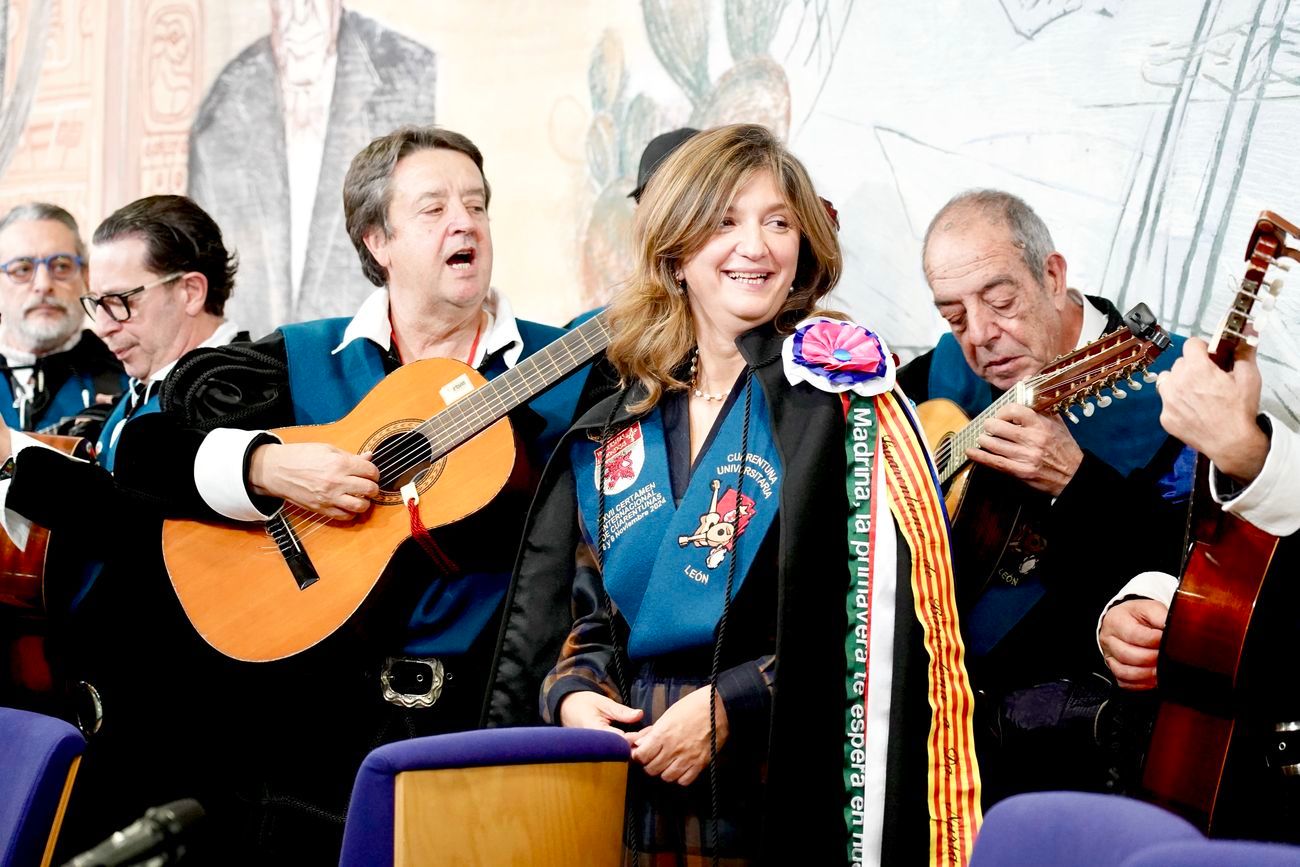 La rectora de la Universidad de León, Nuria González, recibió este martes “con honor y emoción” el madrinazgo concedido por el XXVII Certamen Internacional de Cuarentunas, que se celebra los días 8 y 9 de noviembre en la capital, con la participación de más de 500 miembros de 24 formaciones de España, Portugal, México y Holanda.