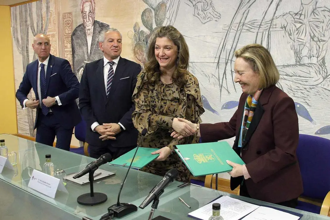 La rectora de la Universidad de León, Nuria González, y la secretaria de Estado de Defensa, Amparo Valcarce, han firmado un convenio para la creación de la Cátedra extraordinaria 'Cátedra ISDEFE de la Universidad de León en Aplicación de Tecnologías en Situaciones de Emergencia (ATSE)'