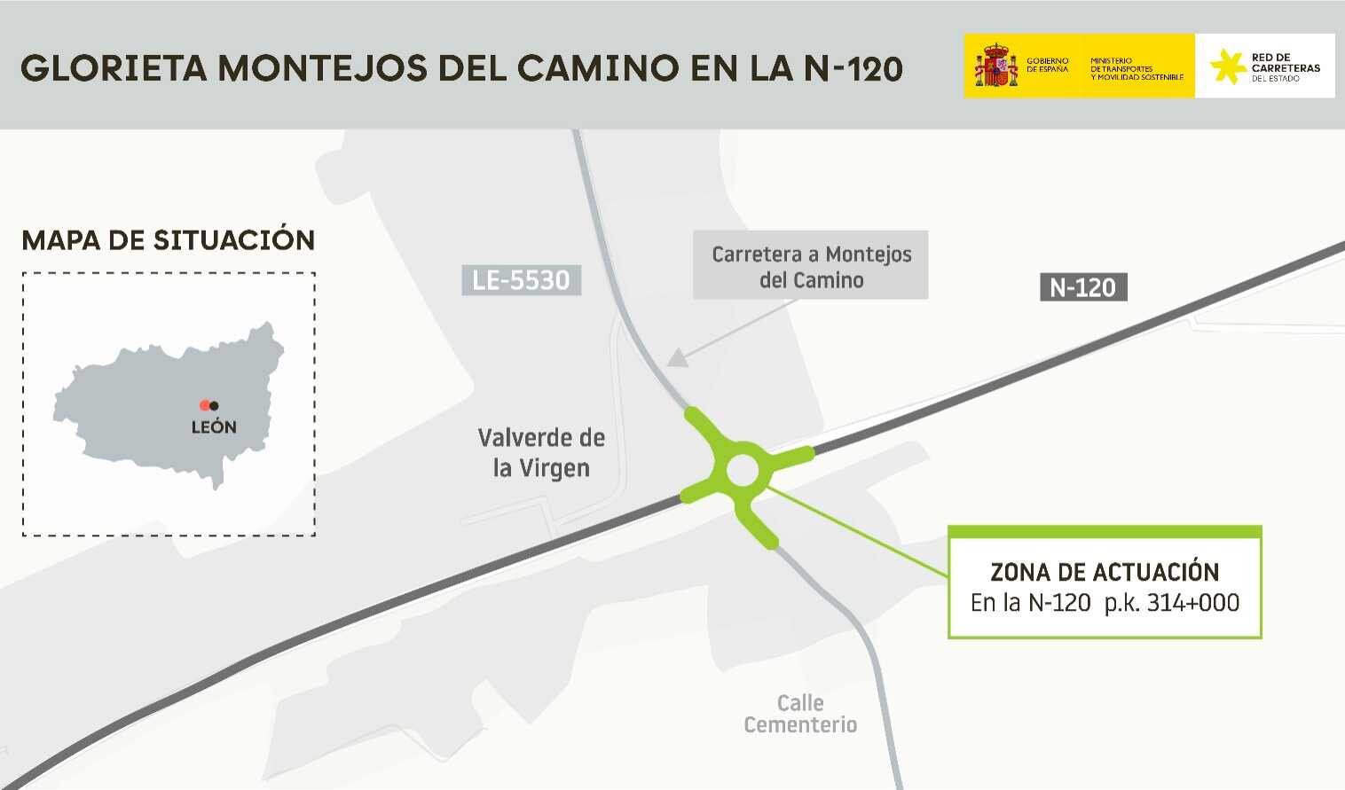 El Ministerio de Transportes y Movilidad Sostenible ha licitado por 549.024 euros (IVA incluido) la construcción de una glorieta en el enlace del km 314 de la N-120 con la carretera LE-5530 hacia Montejos del Camino, en Valverde de la Virgen, León. El anuncio oficial se publicará próximamente en el Boletín Oficial del Estado (BOE).