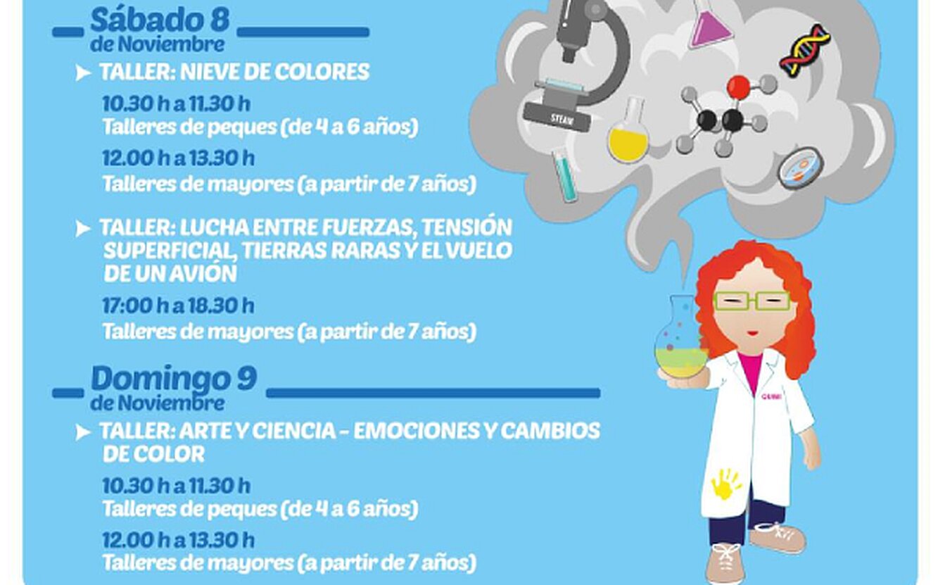 El sábado, a las 10:30 horas, se celebrará el taller ‘Nieve de colores’, mientras que por la tarde, a partir de las 17:00, se desarrollará la sesión ‘Lucha entre fuerzas, tensión superficial, tierras raras y el vuelo de un avión’. En ambos casos, la participación requerirá inscripción previa en el Departamento de Cultura municipal.