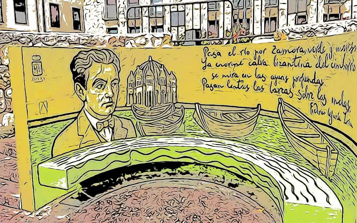 El mural en memoria del poeta andaluz que se inauguró hace algunas semanas en el Mirador del Troncoso es obra de Carlos Adeva. Recoge unas líneas del texto que García Lorca incluyó en su primer libro, Impresiones y paisajes, en cuya prosa juvenil ya aflora el talento literario del autor. El fragmento completo dice así: Pasa el río por Zamora, verde y manso. La enorme calva bizantina del cimborrio se mira en las aguas profundas… Pasan lentas las barcas sobre las ondas. A lo lejos, entre las pardas modulaciones del terreno, asoman los montes pobres de color… Las iglesitas románicas descienden por las callejas hasta el río… Este va lentamente arrastrando su gran prestigio de evocaciones históricas al sonido grave y suave que produce.
