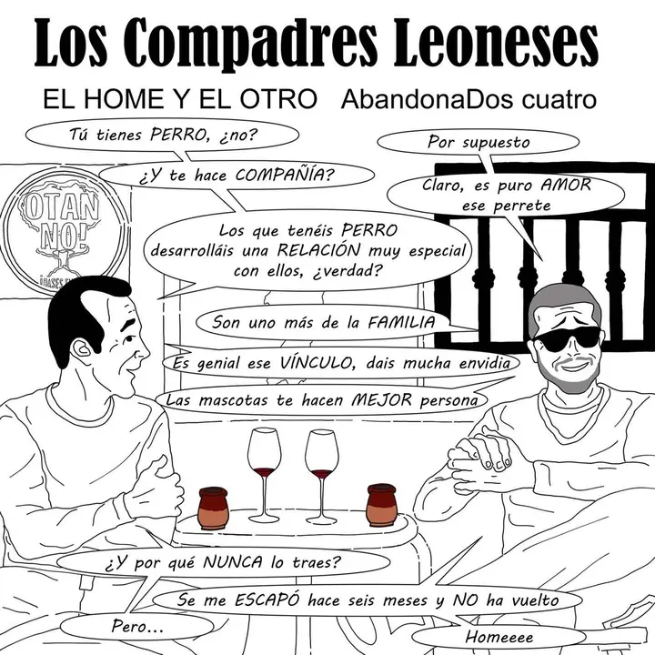 Se están empeñando ciertos líderes de Occidente en tenernos a la expectativa de lo que pueda acontecer en los próximos días, semanas o meses. Con este panorama da un poco de pereza hacer planes a medio plazo, ya que no sabes si se podrá llenar el depósito del coche, si será posible hacer frente al carro de la compra sin vender un riñón, o si directamente no estaremos escondidos en los trasteros a modo de búnker hispánico dentro de unas fechas. Pero, aun así, debo darle vueltas a los próximos acontecimientos vitales, ya que tengo la cabeza demasiado ocupada con las voces de nuestros Compadres Leoneses y, entre mozos y homes, no puedo ver las cosas con claridad. Después de Semana Santa volverán estos queridos paisanos pero, esta vez, sin fecha fija. Han sido catorce meses de publicaciones constantes con algún pequeño parón de por medio y ha resultado demasiado duro hacerlo sin una planificación a largo plazo que, en algún momento próximo, espero tener. Tras organizarme volveré por mis fueros, ya que es lo que me gusta hacer, pero seguramente con menor periodicidad porque me surgen otras obligaciones y, con agendas repletas, las cosas del comer mandan. Os quedáis en buenas manos con la viñeta de Martín durante este tiempo. Encariñarse en demasía con las cosas en esta sociedad que se nos está quedando es como disfrutar de una mascota sin tener claro que nada es para siempre.
